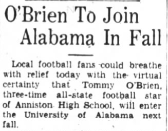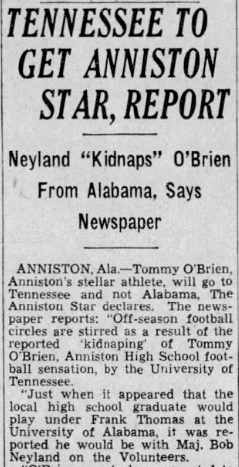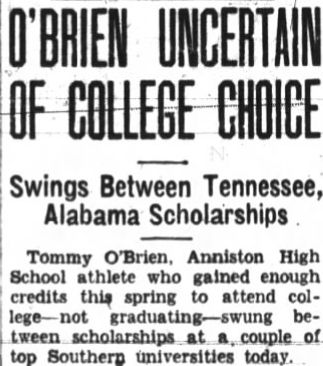 If he chose football, then teenaged O’Brien could have played for any of the South’s leading college teams. But which one? If he chose baseball, professional scouts were well aware of his talents, especially at the plate, and were prepared to offer hefty signing bonuses. In the spring and summer of 1939, O’Brien was repeatedly linked in news stories to each school: reports that he’d picked Alabama, or picked Tennessee, or rejected one, or rejected the other, or been seen on campus in Tuscaloosa or Knoxville, if not both. In August, with football season approaching, he still hadn’t decided, crimson or orange. “I didn’t ask for all this,” he told The Anniston Star. “I’m just an ordinary boy and what to do has got me worried. I have not committed myself to Alabama or Tennessee, in spite of all that has been said.” O’Brien was particularly upset with a Birmingham News report claiming he would select baseball and sign with the New York Yankees. “They got none of that information from me,” he said. The Star even anonymously quoted one of O’Brien’s friends: “Honestly, I feel sorry for the boy. Everybody is trying to advise him to go to this school or that. He’s just a nice kid who happened to be good.”
