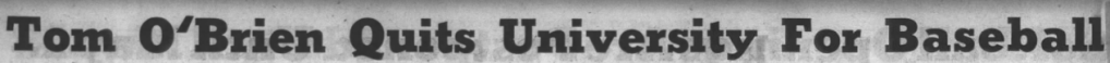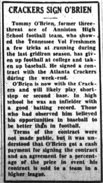 Southern newspapers, unmoved by O’Brien’s hometown fortune, proved unrelenting. Tom Anderson, sports editor of The Knoxville Journal, suggested that O’Brien “could use a lesson in gratitude” after the player had reportedly claimed he would never again play in Knoxville. “It is conservative to estimate that Tommy cost (Alabama and Tennessee) in excess of a thousand bucks, while neither got anything whatsoever in return since the boy never completed his freshman year.” The Knoxville News-Sentinel posited that in east Tennessee, the Vols’ loss of O’Brien “is a worse calamity” than a Franklin D. Roosevelt loss in the next presidential election. The Birmingham News dubbed him “Tailspin Tommy O’Brien” and laughed at the “roundabout way” in which he joined his hometown team. The Nashville Banner enjoyed reporting that “Spartanburg found Tommy O’Brien not good enough for Class B ball.” When O’Brien hit .250 in his first 48 games with the Rams, famed Birmingham sports writer Zipp Newman joined his colleagues’ criticisms. “This time last year, he was one of the most sought-after high school backs in the country. College scouts from four corners of our country were seeking him … All that is left for Tommy to do now is join up with some professional football team. The kid’s a great back and is just unfortunate that his venture into college football didn’t pan out.”